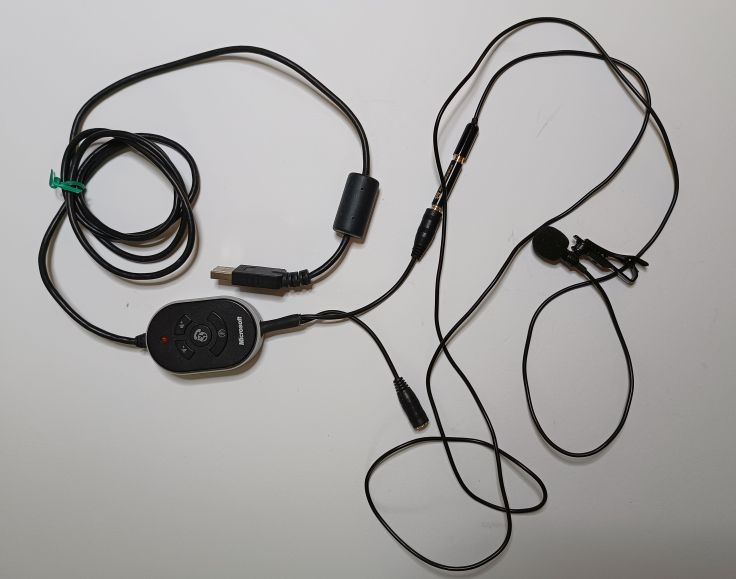 I could of course have just connected the microphone and amp directly to the laptop. I presume that would be as good. The post wouldn’t be complete if I didn’t provide some info about that. But I haven’t tried it so the post will have to remain as it is. A key benefit with using the modified USB LifeChat connector is that I can swap a working LifeChat headset for the modified cable and the laptop sees it as the same thing and I don’t need to modify the input or output device in any apps. It also has handy mute and volume buttons.