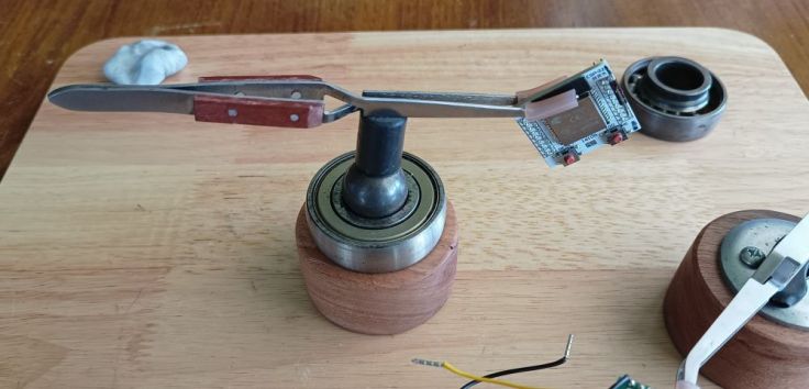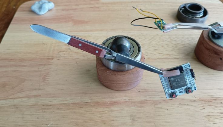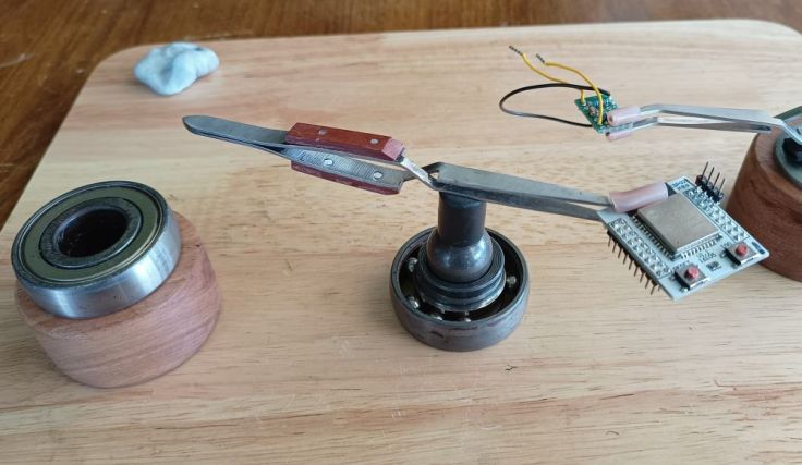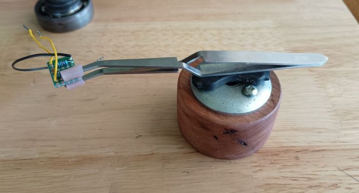 The large ball bearing combined with the roller bearings, magnet from the shaky torch and tweezers turned out to be a good combination. The magnet is strong enough to hold everything together, even including the ball bearing in the roller bearing, and it’s smooth to adjust. It just holds components and small modules in place, but not larger circuit boards. One downside and that is components and tools are attracted to the roller bearing because of the magnet. I ended up fastening one of the bearings on to the top of a piece of hardwood to prevent that.