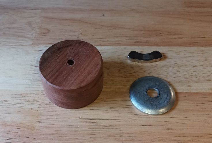 I also made a simpler version without the ball-bearing pivot. I drilled holes through an old washer (from a long-hoarded car shock absorber I had been holding on to for 40 years) and screwed it onto a piece of timber. The magnet for this one came from an old hard drive.