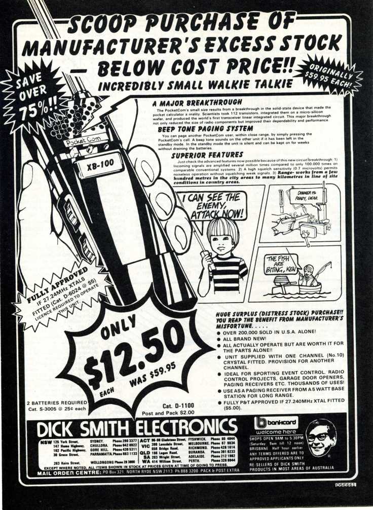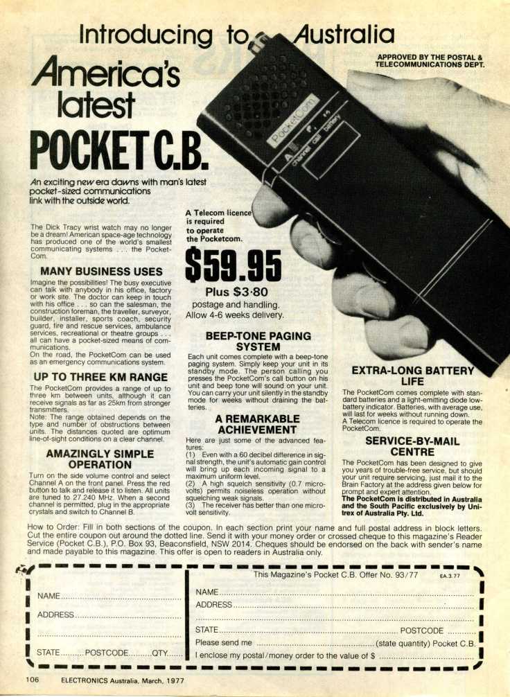 Electronics Australia was a local electronics magazine. It had an advert for PocketCom walkie talkies for AUD$59.95. They were really small, particularly for one that was not considered a toy. I thought they would be really cool.