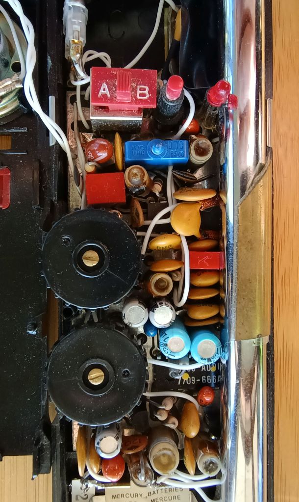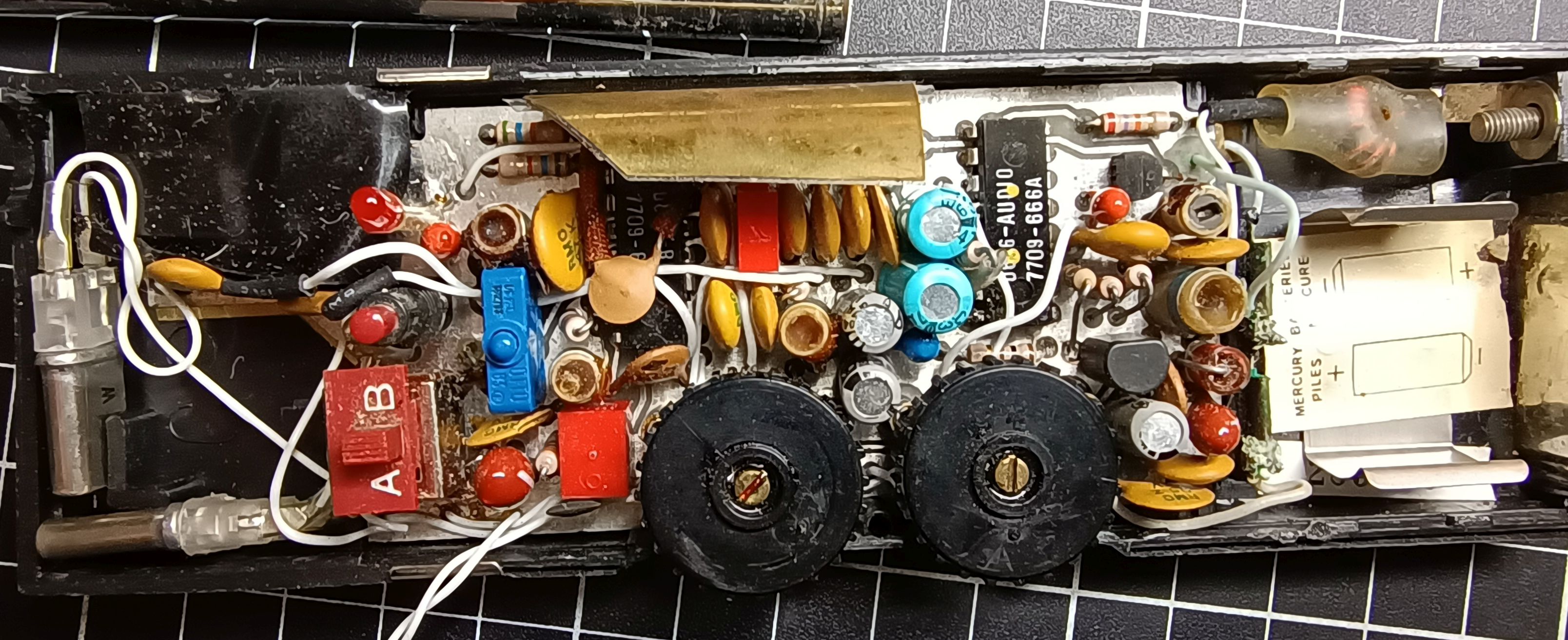 Inside everything is very compact. The crystals for channel B are visible. Those for channel A are under black tape behind the antenna