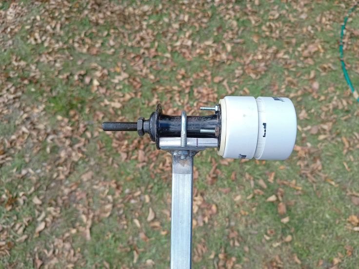 Another PVC end cap had a hole drilled and was bolted to the top of the axle between the top hub cone and another nut. Above that the vane was fastened with another nut.