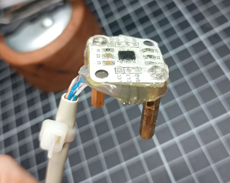 I coated the sensor with hot melt glue to provide a sort of conformal coating to protect it from moisture.