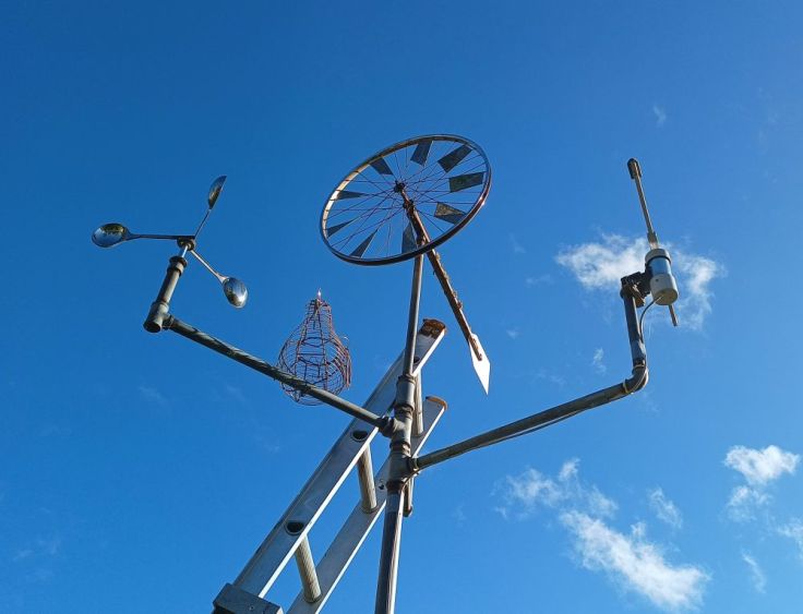 I have made a few spinning things that I have mounted on a pole. They have no purpose, they just spin in the wind and are interesting to look at. What I have discovered is that bicycle hubs are fairly easy to obtain, work well, easily maintained and last for many years. I have a bicycle wheel that has been spinning for about 20 years. The anemometer looking thing is just a bunch of soup ladles mounted on a bicycle hub. It will remain, but will not be used for the anemometer as it is fairly rusty now. The new wind vane is on the right.