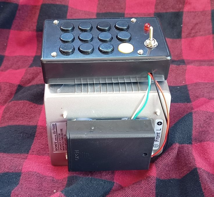 I wanted to build a sound effects machine that played one of 11 files. The components and buttons to be built into a small project box, with the it and a 3 x 1.5 AA battery box mounted on a small speaker.
