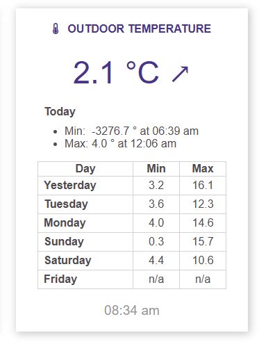 We have quite a few frosts here during winter. As the sensor was reading too high I didn’t notice another issue until one day the temperature apparently fell to -3276.7°C. Surely that must be a record, not just for our area but also for the universe.