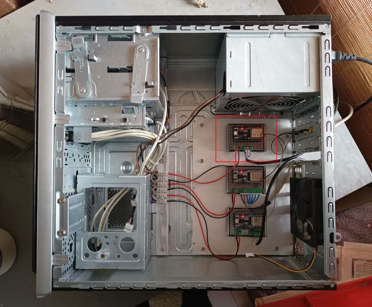The ESP32 board (highlighted red) for the outdoor unit is in a PC case, powered by a Meanwell 5V power supply which sits in our garage