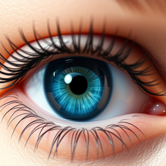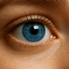 Neutral gaze: A hyper-realistic close-up of a human eye with a vivid blue iris, open and looking straight ahead. Fine lashes, detailed skin texture, and soft reflection lighting. Neutral gaze, natural eye moisture and subtle shadows.