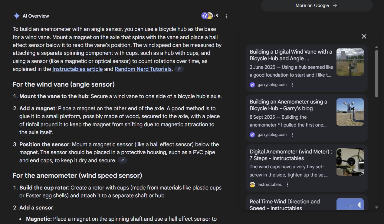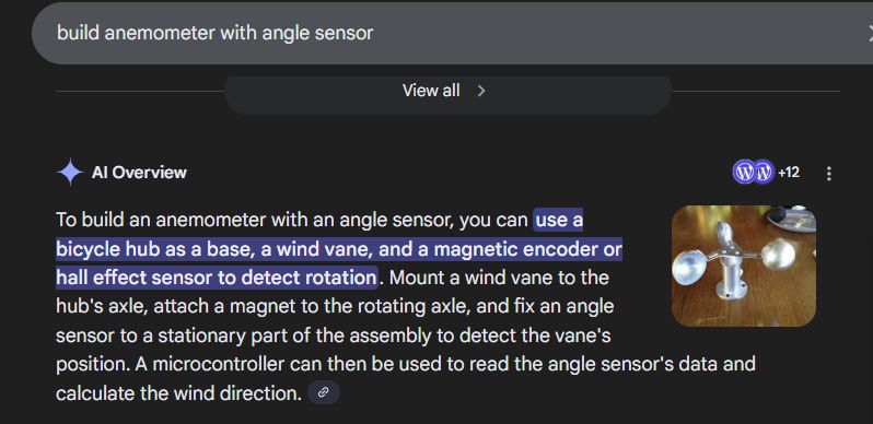 I did a quick Google search to see if I could find any references for this. I searched for “build anemometer with angle sensor”. Something in the AI Overview immediately caught my eye. The image on the right comes from my blog post Inside a Cheap Aluminium Anemometer. That anemometer doesn’t use an angle sensor, it uses a cheap toy motor, but at least it is an anemometer.
