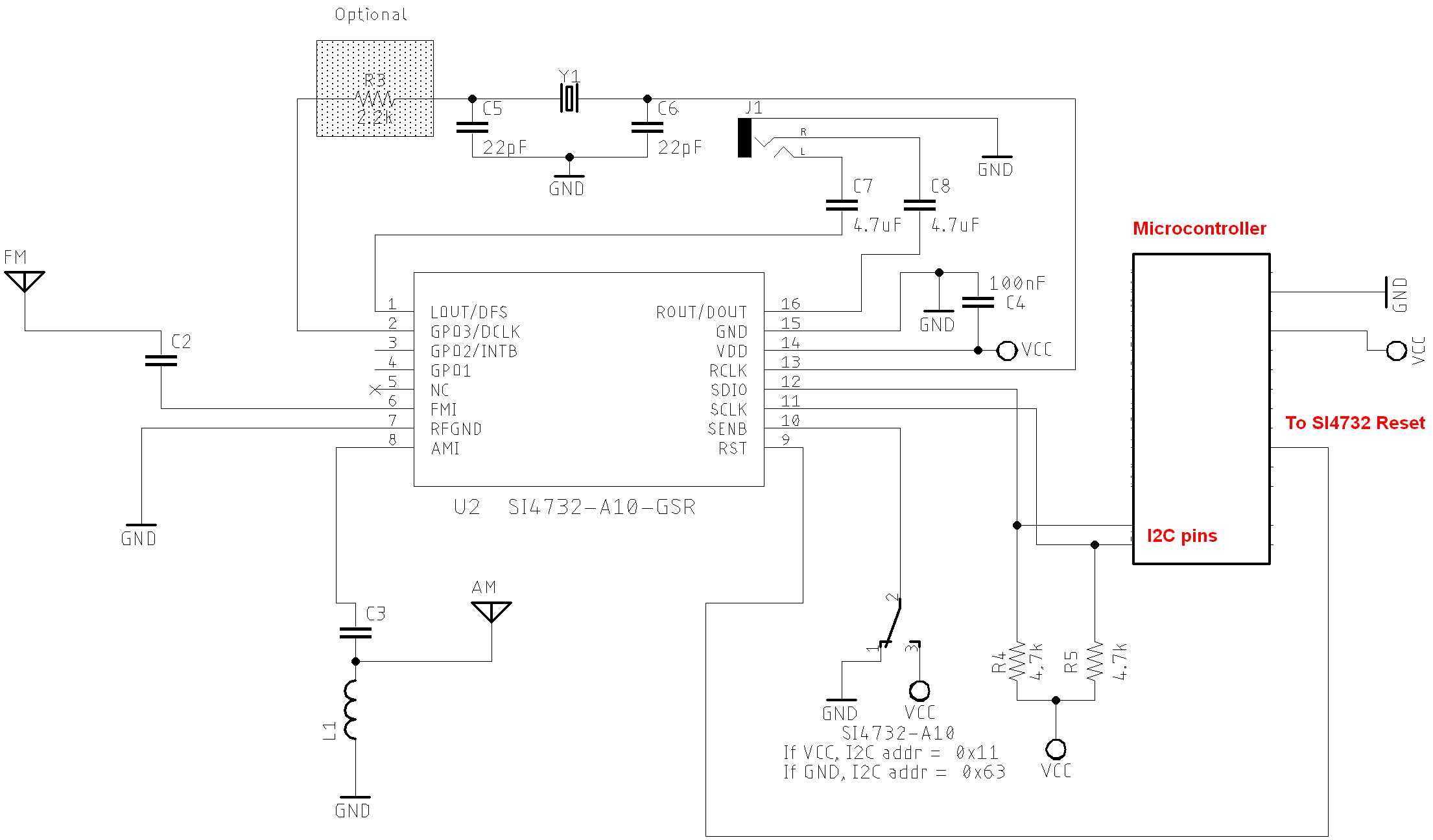 I started with a breadboard, but quickly decided to go to a more modular construction. I looked at the SI4732 circuit diagrams and decided to create a module with it and its support components. The Preface library page has information about the circuit. The SI4732 part of the circuit I am using is very similar to the one on the library circuits page under All Sketches on SI47XX_01_SERIAL_MONITOR folder. It’s the one for the SI4732-A10 Version. I didn’t include the AM coil and I am using an ESP32, not an Arduino Pro Mini. This is a modified copy of the image from there. This shows the diagram of just the radio part and how it connects to the microcontroller. Click on it to see a bigger version