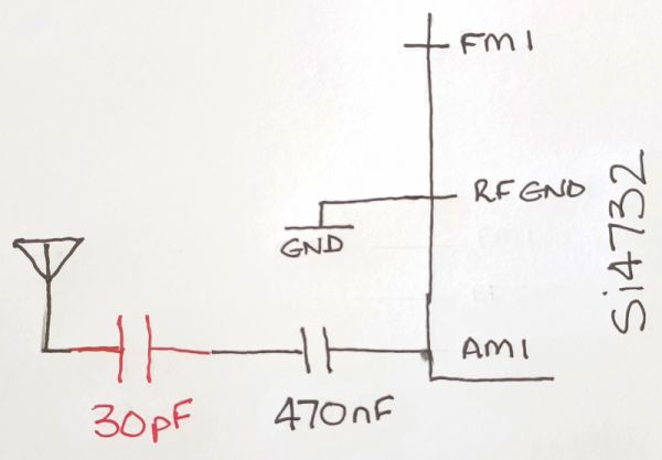 I only intend to use the radio for SW so I didn’t connect up an antenna for FM or AM. I experimented with antenna circuit above and a longwire (about 10m) antenna. After I while I thought I was missing stations and tried researching other designs. What I found is that the Si4732 can be easily overloaded. I found adding the coil L1 didn’t help with SW so I just used the 470nF capacitor. It still wasn’t very good and the best solution I’ve found is adding another small capacitor in series. I found 30pF works fairly well.