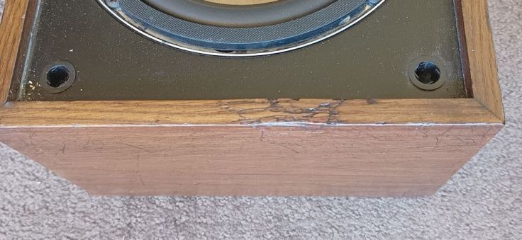 It’s not immediately obvious in the picture, but the foam surround for the woofer has completely gone. I’ve replaced the surround on a few speakers and it’s not expensive to do, even a badger like myself can do it. The tweeter has been pushed in so it will also need some work.