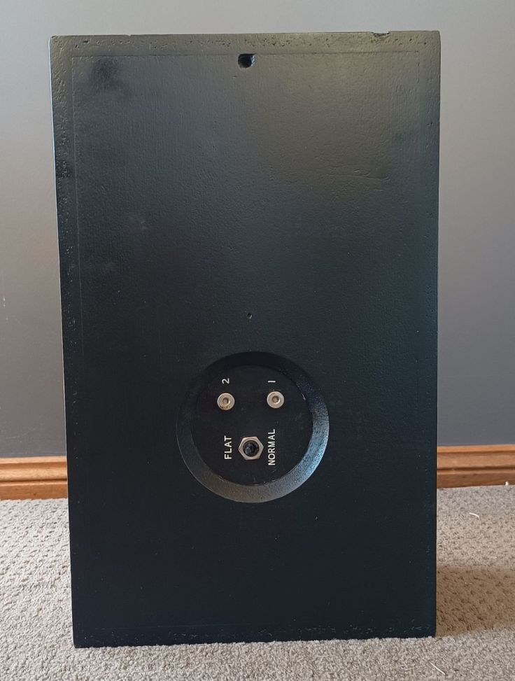The back of the cabinet. Notice the Flat and Normal switch. The connections marked 1 and 2, instead of + and -.