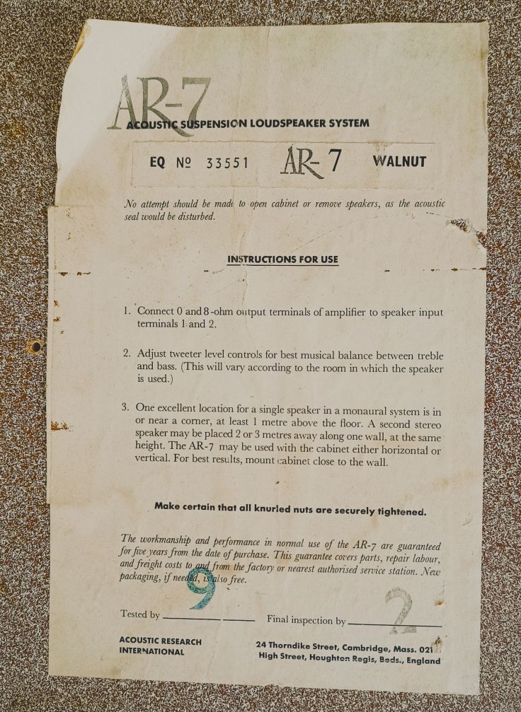 I read that AR-7s cost US$70 in 1973. I’m not sure if that is for one or a pair. In today’s dollars that is about $500. That’s a significant amount. I thought they could have been a bit neater attaching the Velcro for the grill.