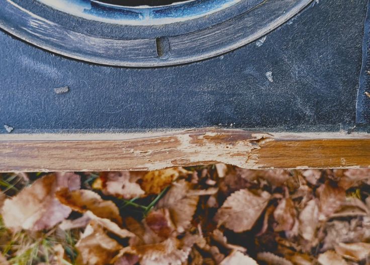 The dent has been sort of fixed. I massaged some glue into the chipboard and veneer and then clamped it firm. It’s obvious it is still there but now it’s a part of the story instead of a defect. Or at least that’s how Im looking at it. I also put a clear coat of polyurethane over all the veneer.