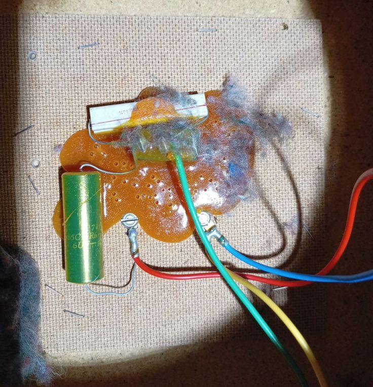 This is the ‘crossover’ sealed and held in with a lot of glue. I did not expect this. I think what we have here is a pair of wires going directly from the screw terminals to the woofer. The tweeter is connected via a single capacitor with a resistor for flat/normal that can be switched in or bypassed. If I am correct, that is very basic crossover.