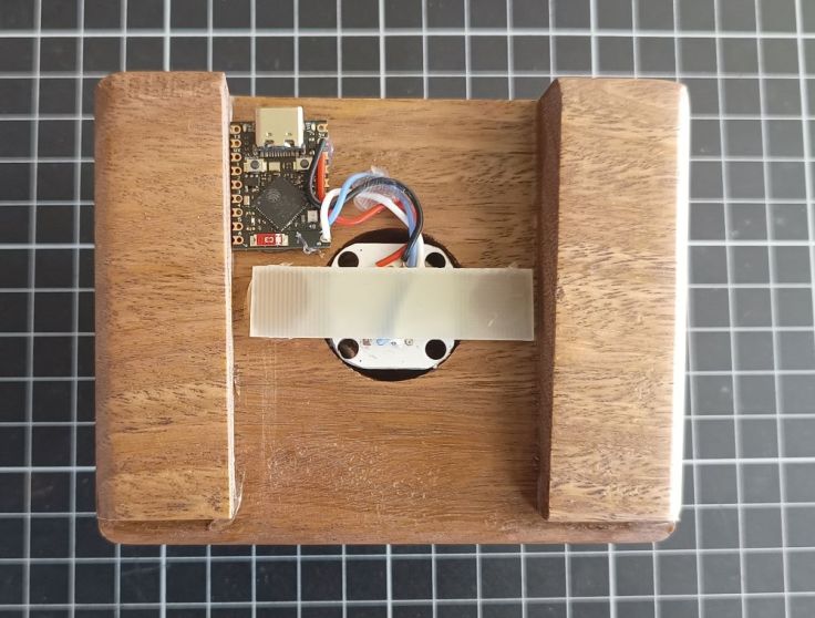 I drilled a 25mm hole most of the way through the centre of one piece to house the sensor and magnet assembly. I had intended to connect a permanent USB cable to the ESP32-S3 Super Mini. I went looking for the data connections and found they were not broken out on this module. They are only available through the USB socket, so I gave up on that idea.